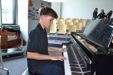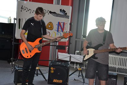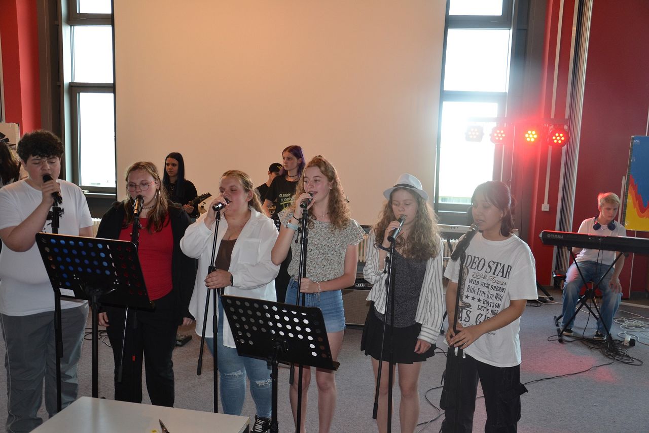 Die Klasse 8a stellte als Band Illusion den Song „Numb“ von Linkin Park vor, wobei Noah am Flügel dem Stück eine ganz besondere Dynamik verlieh. Die Klasse 8c hatte als Burning (bad)s den Oldie „Beds are burning“ von Midnight Oil einstudiert. Außer Schlagzeugerin Julia hatten hier alle Bandmitglieder ihre Instrumente neu erlernt. Zu diesem Auftritt gehörten auch eine Powerpoint-Präsentation und Teenager an der Technik. „Besonders die Zusammenarbeit in der Band und dass wir uns über alles ausgetauscht haben, war cool“, bilanziert Fabienne und Fynn fand am besten, dass er ein neues Instrument gelernt hat. Ben mochte an dem Projekt besonders, dass kein Notenstress im Spiel war und Sophies Meinung lautet, dass man kreativ sein konnte und der Spaß im Vordergrund stand.