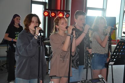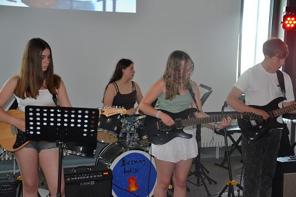 Musikalisch unterstützt wurden die achten Klassen von der Abschlussband der Neuner und Zehner, die „Irgendwie, irgendwo, irgendwann“ (Nena), Zombie (The Cranberries) und „Die with a smile“ (Lady Gaga und Bruno Mars) präsentierten.
