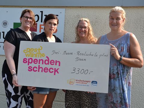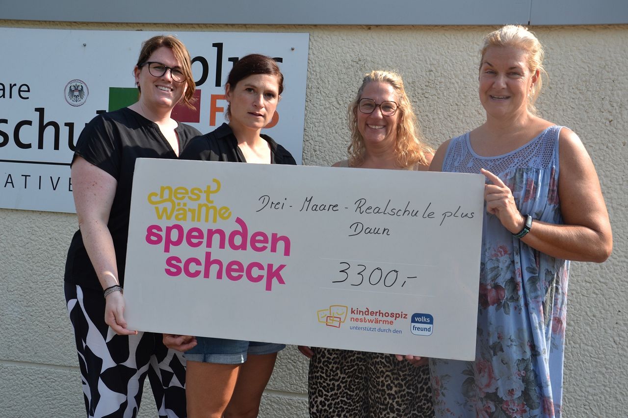 Am 15. August übergab die Drei-Maare-Realschule plus Daun eine Spende in Höhe von 3300 Euro an das Kinderhospiz Nestwärme Trier. Im Vorfeld war im Mai der 50-jährige Geburtstag der Schule gefeiert worden. Dafür hatte die Schulgemeinschaft zahlreiche Projekte durchgeführt, die im Rahmen eines Fests präsentiert wurden. Zudem hatte das Landespolizeiorchester ein Benefiz-Konzert veranstaltet und die Schule hatte sich im Zeichen von Solidarität und gemeinschaftlichem Engagement dazu entschieden, die Hälfte der Erlöse an Nestwärme zu spenden.